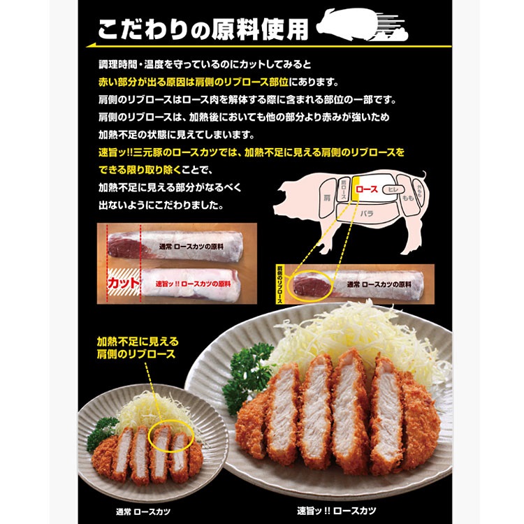 「三元豚」のロース肉を使用し、ジューシーな旨味としっかりした肉質に、衣のサクサクした食感が特徴です。