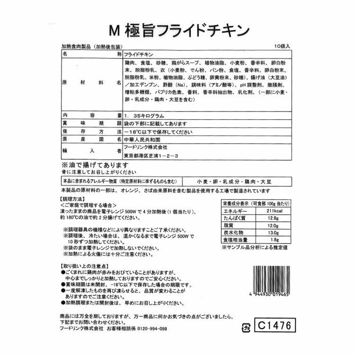 凍ったままの商品を電子レンジ500Wで4分加熱後(1個当たり)、約180℃の油で約2分揚げてください。
