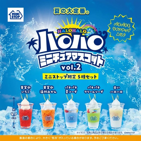 MINISTOP ハロハロミニチュアマスコット <商品のラインナップ> ・果実氷 いちご ・果実氷 温州みかん ・パチパチ夏ソーダ ・パチパチクリームソーダ ・白いハロハロ 各1個全5種フルコンプセットでお届けします。