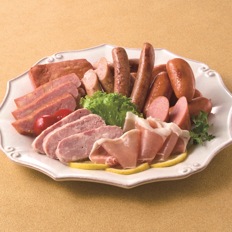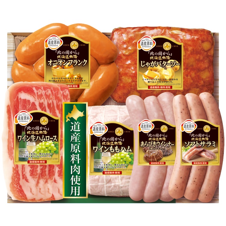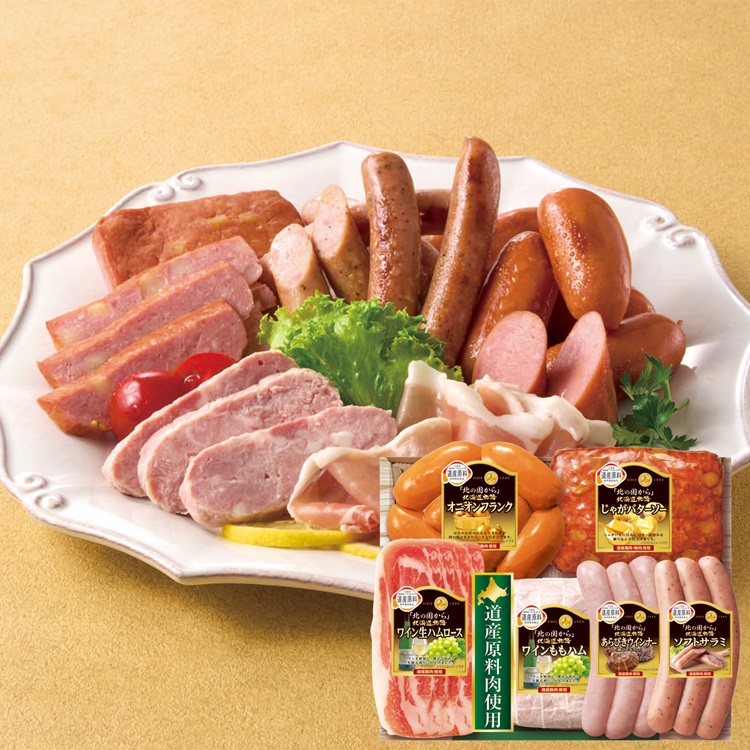 【商品内容】 ワインももハム130g、ワイン生ハムロース35g、じゃがバターソー・オニオンフランク各180g、ソフトサラミ・あらびきウインナー(帆立エキス入り)各75g