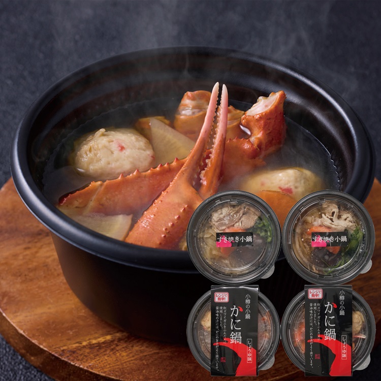 【商品特長】 レンジで簡単にできる小鍋ギフト。北海道産牛を使用したすき焼き小鍋2食と、3種類の小鍋が選べるギフトです。かになどの海鮮と野菜が入ったかに鍋です。