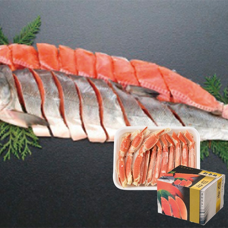 【商品内容】 ボイルずわい蟹半剥き身(棒脚・爪・爪下・肩肉)合計700g(ロシア又はアメリカ産)、新巻鮭姿約1.4kg(6分割真空)(全て北海道にて加工)