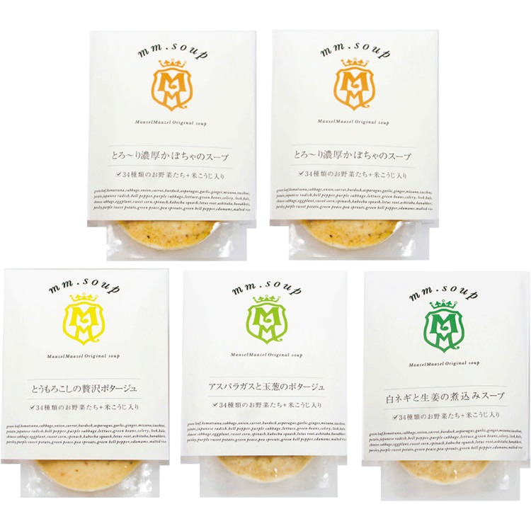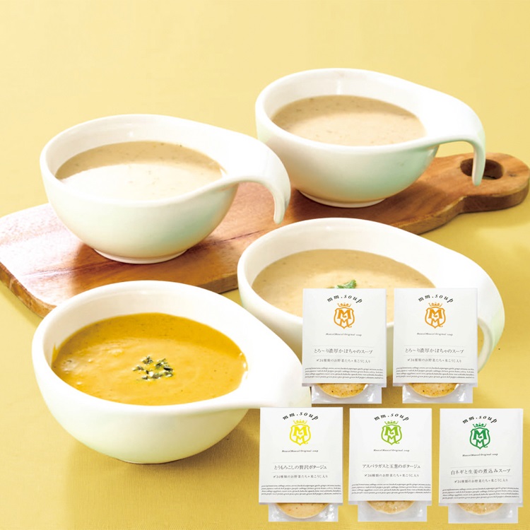 【商品内容】 とろーり濃厚かぼちゃのスープ×2・とうもろこしの贅沢ポタージュ・アスパラガスと玉葱のポタージュ・白ネギと生姜の煮込みスープ各180g