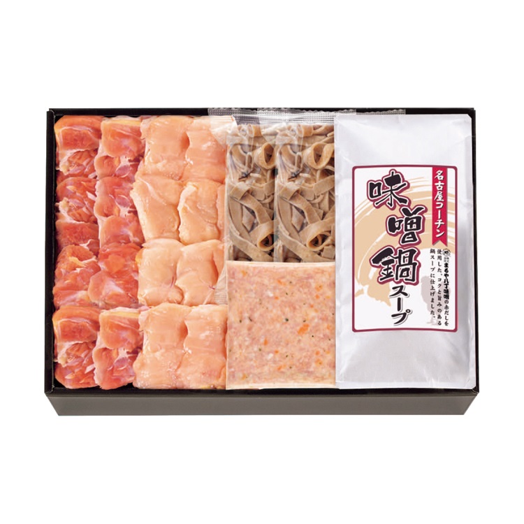 【商品内容】 約3~4人前/名古屋コーチン((もも肉・むね肉)合計220g・つみれ150g)、全粒粉入りうどん220g×2、味噌鍋スープ600g
