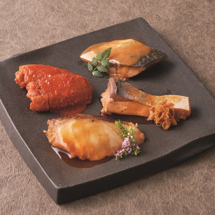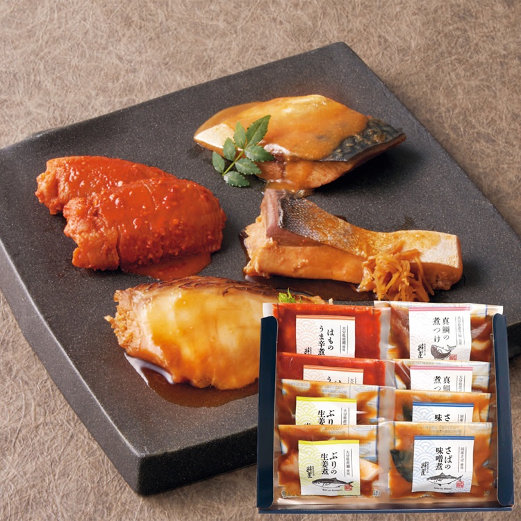【商品内容】 ぶりの生姜煮・真鯛の煮つけ・さばの味噌煮・はものうま辛煮各70g×各2