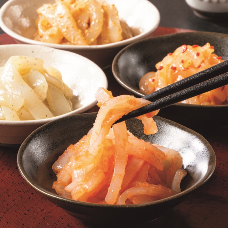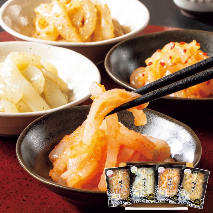 【商品特長】 柔らかく甘みのある剣先いかを4種の味でお楽しみいただけるお刺身セットです。