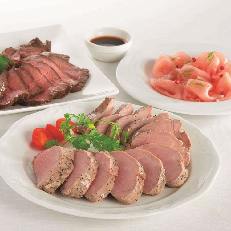 【商品内容】 豚ひれ肉のやわらかローストポーク360g、直火焼ローストビーフ(グレービーソース付)160g、ロース生ハム67g