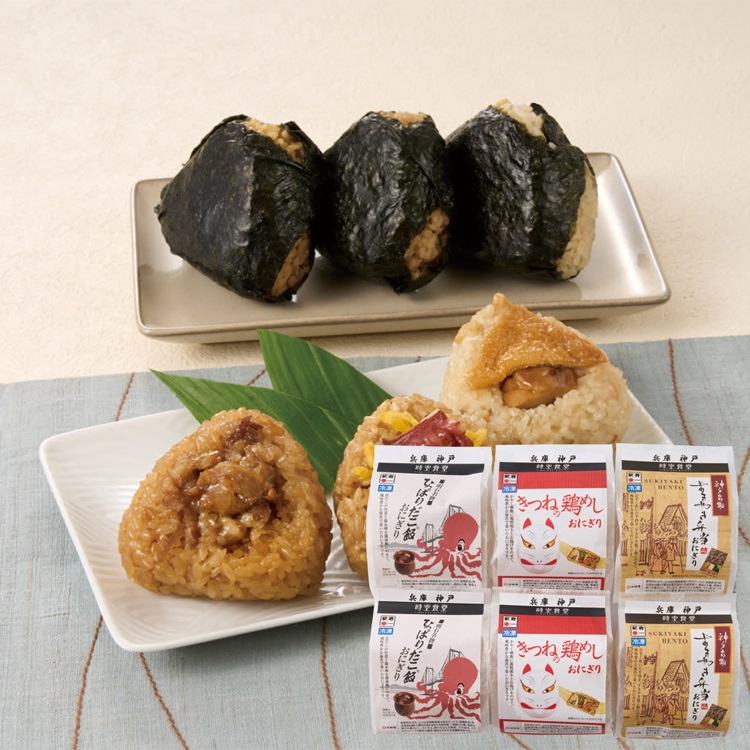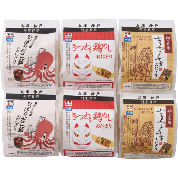 【商品内容】 ひっぱりだこ??飯おにぎり・きつねの鶏めしおにぎり・神戸名物すきやきおにぎり各95g×各2
