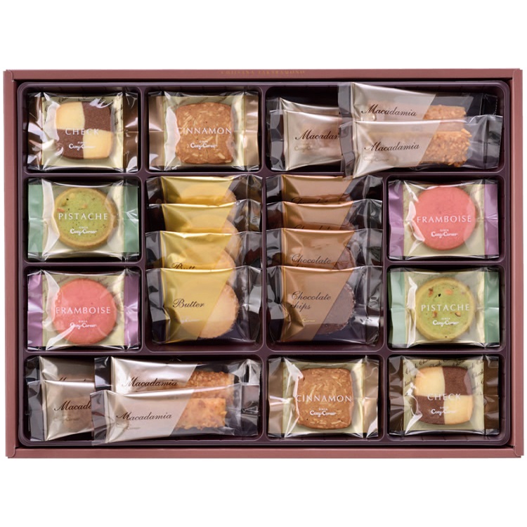【商品内容】クッキー(フランボワーズ・ピスターチ・チェック・シナモン)×各6、クッキー(バター・チョコチップ)×各4、バトンマカダミア×8■賞味期限:製造後90日 ■包装形態:簡易包装■熨斗:外のし■持参包装:不可■配達区分:常温■希望着日:不可※着日指定の受付はできません。ご注文確定の15日前後にお届けします。