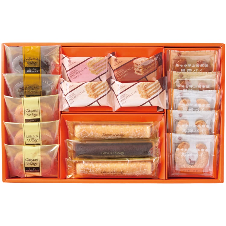 【商品内容】横浜馬車道ミルフイユ(バニラ×2・フランボワーズ・キャラメルラテ)、幸せを呼ぶ馬車道馬蹄パイ(シュガーバター×3・キャラメル×2)、ガトースフレ(ふっくら芳醇フロマージュ×3・ふっくら濃厚ショコラ×2)、ガトーウィークエンド(オレンジ)×2、ガトーオガナッシュ■賞味期限:出荷後90日 ■包装形態:簡易包装■熨斗:外のし■持参包装:不可■配達区分:常温■希望着日:不可※着日指定の受付はできません。ご注文確定の15日前後にお届けします。