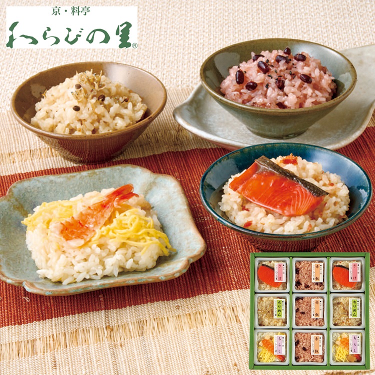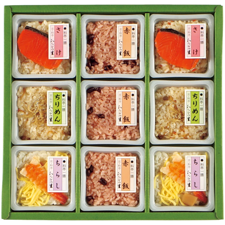【商品特長】電子レンジで簡単調理。常温で日持ちする料亭の炊き込みご飯です。【商品内容】赤飯90g×3、鮭ごはん・ちりめんごはん・ちらし寿司各90g×各2■賞味期限:製造後75日 ■包装形態:簡易包装■熨斗:内のし■持参包装:不可■配達区分:常温■希望着日:不可※着日指定の受付はできません。ご注文確定の15日前後にお届けします。