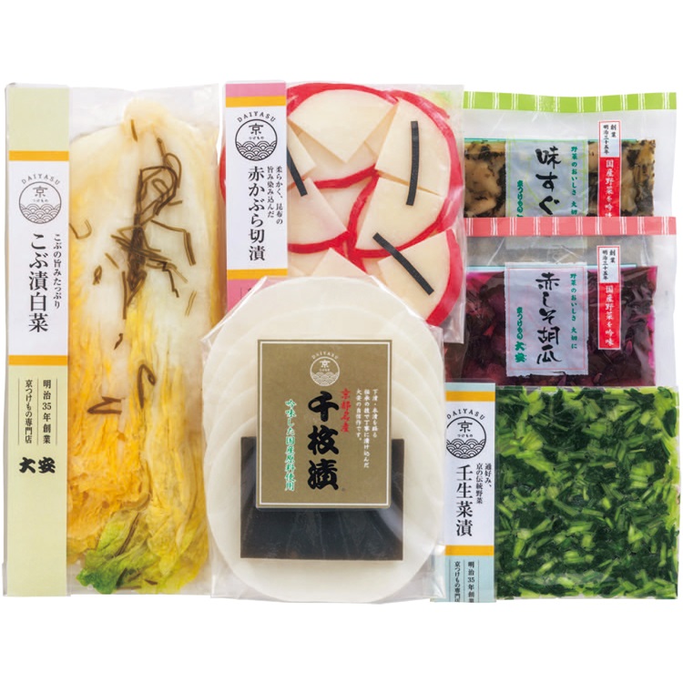【商品特長】京都の代表的な漬物「大安」の千枚漬を中心に旬の野菜を取り揃えました。【商品内容】千枚漬70g、赤かぶら切漬62g、こぶ漬白菜132g、壬生菜漬・味すぐき・赤しそ胡瓜各40g■賞味期限:製造後9日 ■包装形態:簡易包装■熨斗:内のし■持参包装:不可■配達区分:冷蔵■希望着日:不可※着日指定の受付はできません。ご注文確定の15日前後にお届けします。