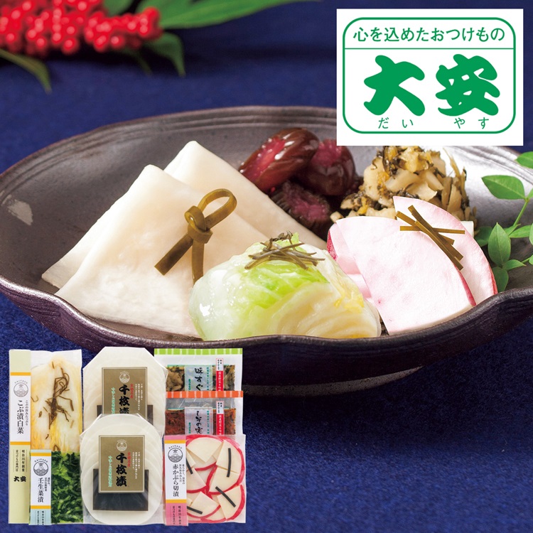 【商品特長】京都の代表的な漬物「大安」の千枚漬を中心に旬の野菜を取り揃えました。【商品内容】千枚漬70g×2、赤かぶら切漬62g、こぶ漬白菜132g、壬生菜漬・味すぐき・しその実漬各40g■賞味期限:製造後9日 ■包装形態:簡易包装■熨斗:内のし■持参包装:不可■配達区分:冷蔵■希望着日:不可※着日指定の受付はできません。ご注文確定の15日前後にお届けします。