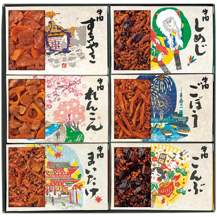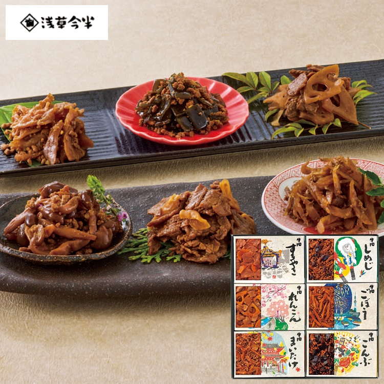 【商品特長】国産の牛肉と野菜を代々受け継ぐ製法で炊き上げた牛肉佃煮詰合せです。【商品内容】牛肉すきやき・牛肉ごぼう・牛肉れんこん・牛肉まいたけ・牛肉しめじ・牛肉こんぶ各55g■賞味期限:製造後270日 ■包装形態:簡易包装■熨斗:内のし■持参包装:不可■配達区分:常温■希望着日:不可※着日指定の受付はできません。ご注文確定の15日前後にお届けします。