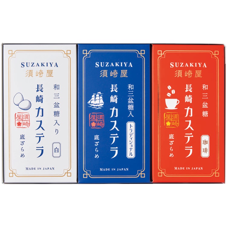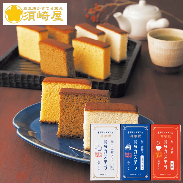 【商品特長】五三焼かすてらの老舗「須崎屋」が焼き上げる、和三盆糖を使用した甘さすっきりの長崎かすてらを3種詰合せました。【商品内容】長崎カステラ(トラディショナル・珈琲・白)各5切■賞味期限:製造後40日 ■包装形態:簡易包装■熨斗:外のし■持参包装:不可■配達区分:常温■希望着日:不可※着日指定の受付はできません。ご注文確定の15日前後にお届けします。