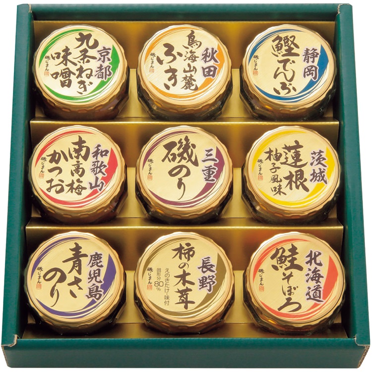 【商品内容】 京都九条ねぎ味噌・和歌山南高梅かつお・三重磯のり・鹿児島青さのり各90g、秋田鳥海山麓ふき・静岡鰹でんぶ各45g、茨城蓮根柚子風味55g、長野柿の木茸85g、北海道鮭そぼろ40g
