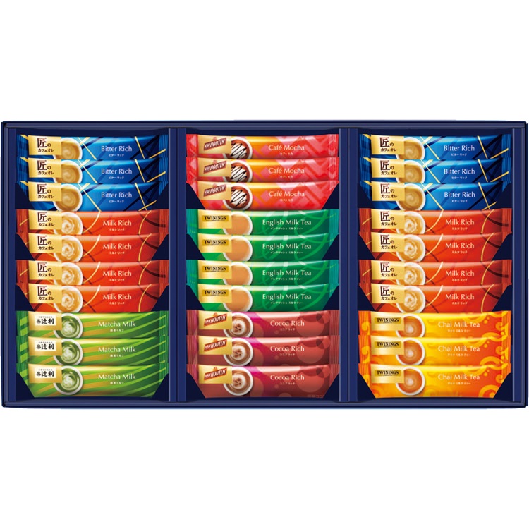 【商品内容】 匠のカフェオレ(ミルクリッチ12.4g×8・ビターリッチ10.6g×6)、トワイニング(イングリッシュミルクティー14.9g×4・チャイミルクティー14.9g×3)、辻利抹茶ミルク17g×3、バンホーテン(ココアリッチ18g・カフェモカ15g)×各3