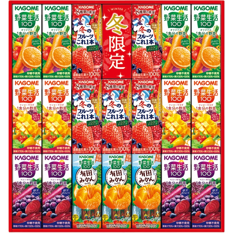 【商品内容】 野菜生活100(オリジナル・ベリーサラダ・マンゴーサラダ)各200ml×各4、野菜生活100有田みかんミックス195ml×3、冬のフルーツこれ1本200ml×5