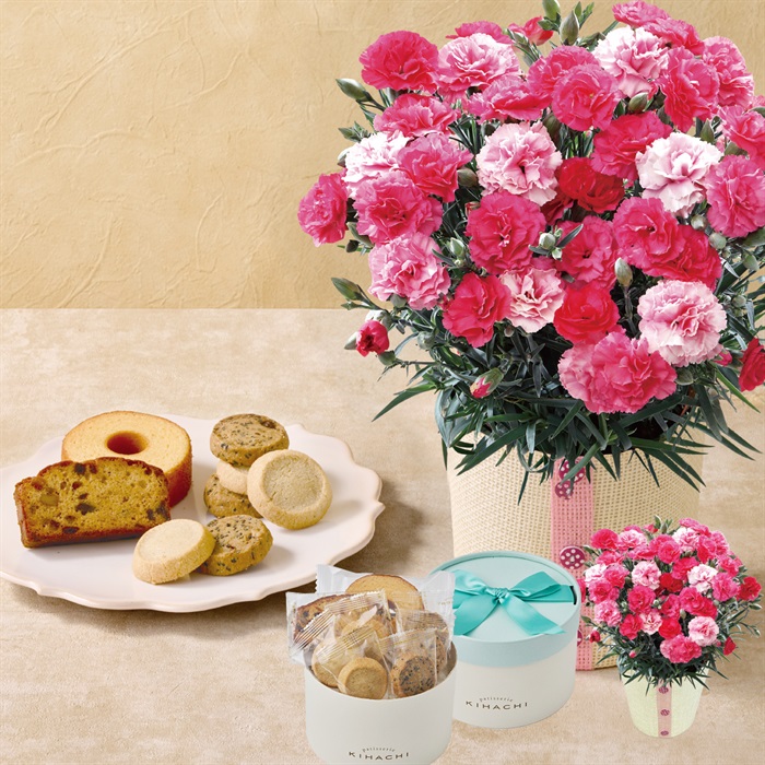 【商品内容】カーネーション5号鉢、バスケット、お手入れのしおり、アソートBOX(黒胡麻と黒糖クッキー×3・バニラクッキー×3・バームクーヘン プレーン・ケークアングレ) ”商品サイズ:幅約15cm×高さ約30cm”■賞味期限:出荷後45日■包装形態:包装不可■熨斗:対象外■配達区分:常温■希望着日:不可■受付終了日:5/1 9:59まで■お届期間:5/6-5/10■外装サイズ:縦20cm×横20cm×高さ55cm■型番:A40-1■全国配送:無し