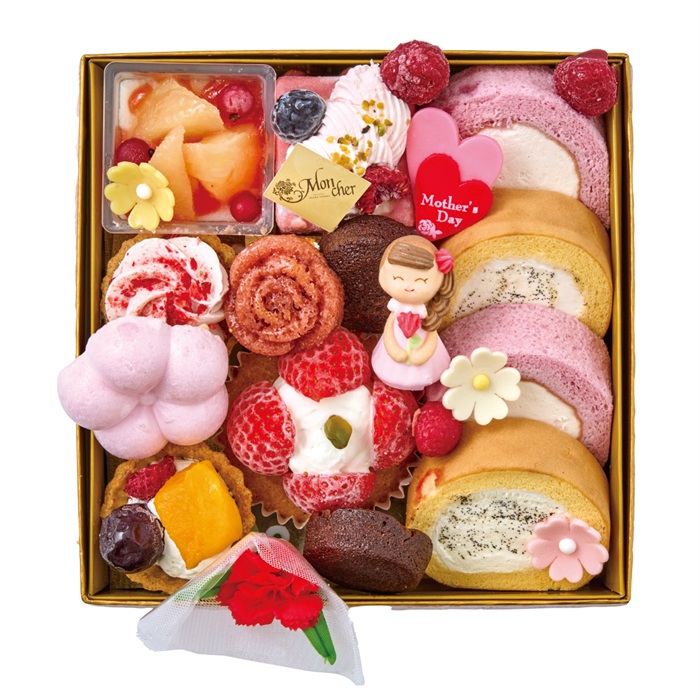 ミニロール(バニラ・ベリー)×各2、フィナンシェショコラミニ×2、ムースピスタチオルージュ、桃プリン、ベリークリームタルト、梅ロッシェ、フルーツタルト、ストロベリーケーキ、ミニバラのフィナンシェ(フランボワーズ)、スマイルママ(砂糖菓子)、母の日ダブルハート(ハート型チョコ菓子)、お花型チョコ(ピンク・白・黄)、果実(フランボワーズ×5・ブルーベリー)、造花(カーネーションピック)