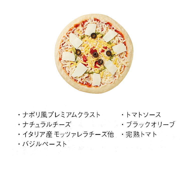 ・ナポリ風プレミアムクラスト・トマトソース・ナチュラルチーズ・イタリア産モッツアレラチーズ他・バジルペースト・ブラックオリーブ・完熟トマト