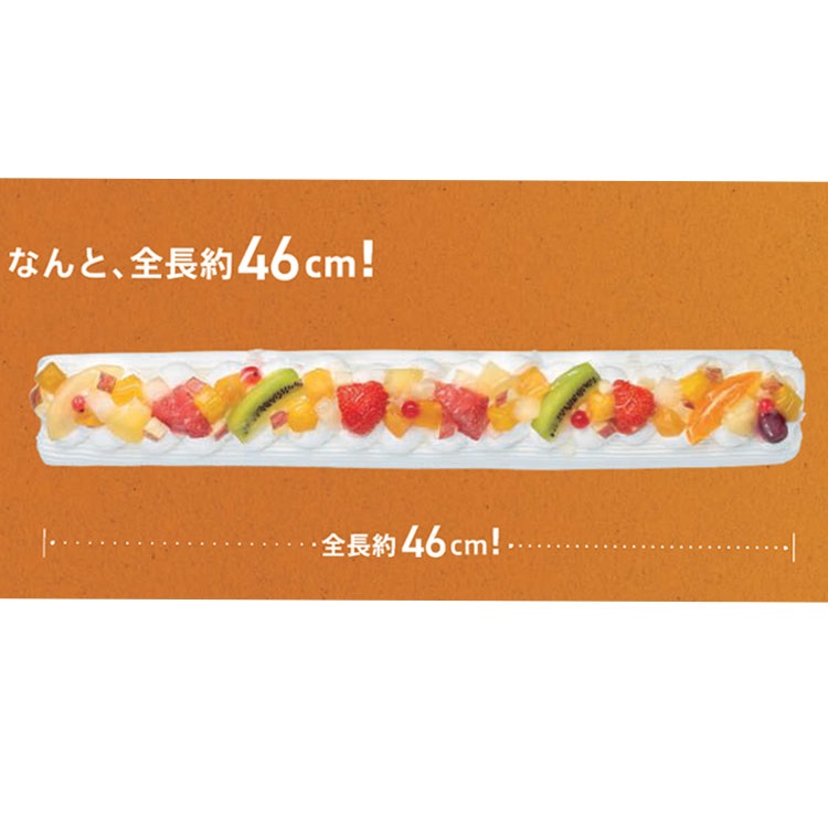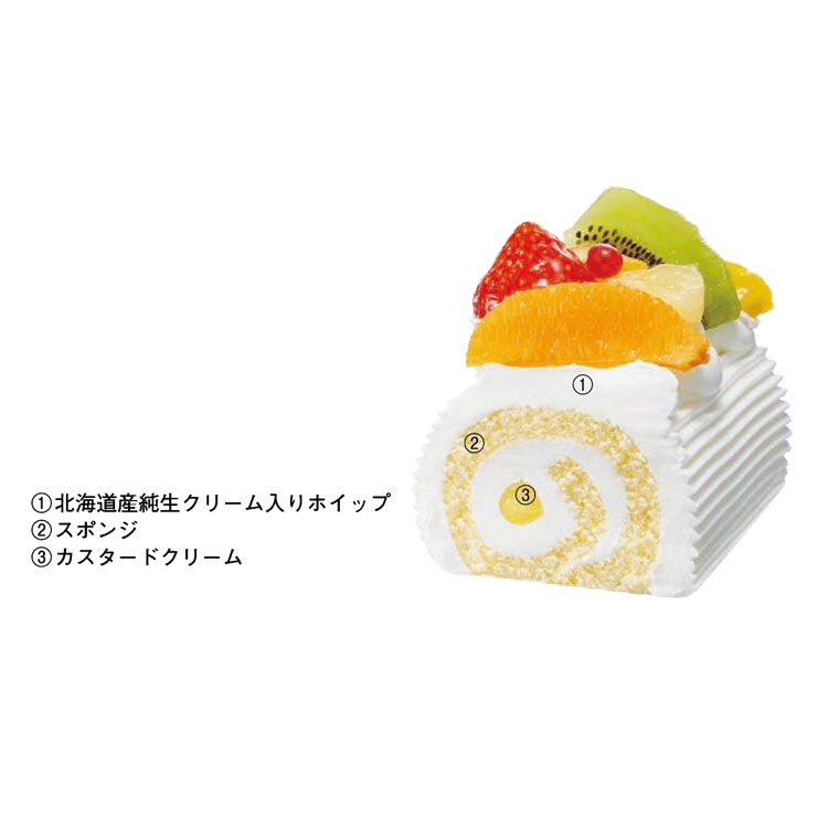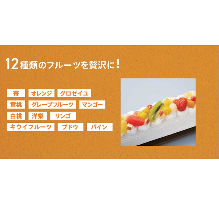 北海道産純生クリーム入りホイップを使用したなが~いロールケーキに、12種類のフルーツをたっぷりのせました。 ※専用持ち帰り袋付