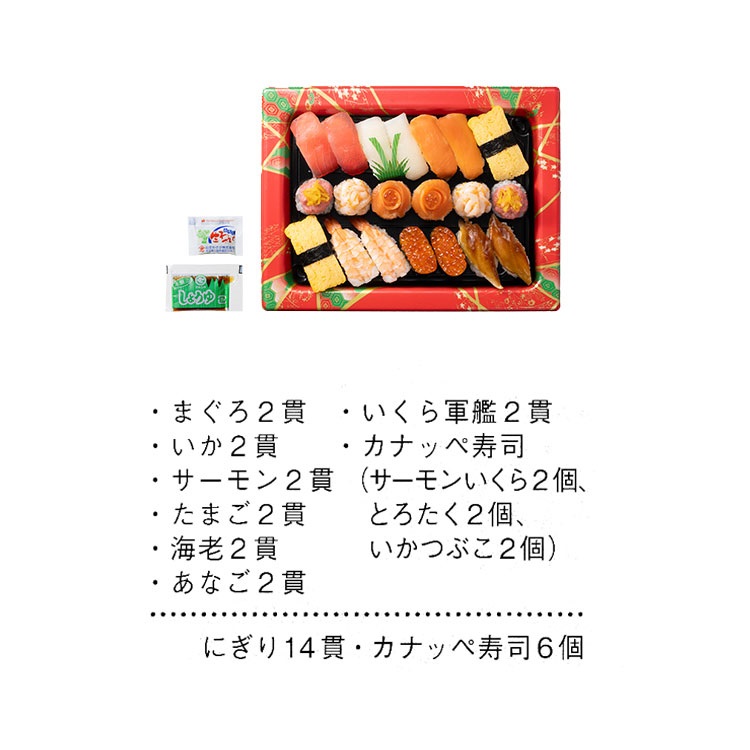 にぎり寿司14貫と巻寿司に海鮮ネタを載せたカナッペ風の寿司6貫の計20貫で仕立てました。 【専用お持ち帰り袋付】 【醤油小袋2袋、わさび小袋2袋付】