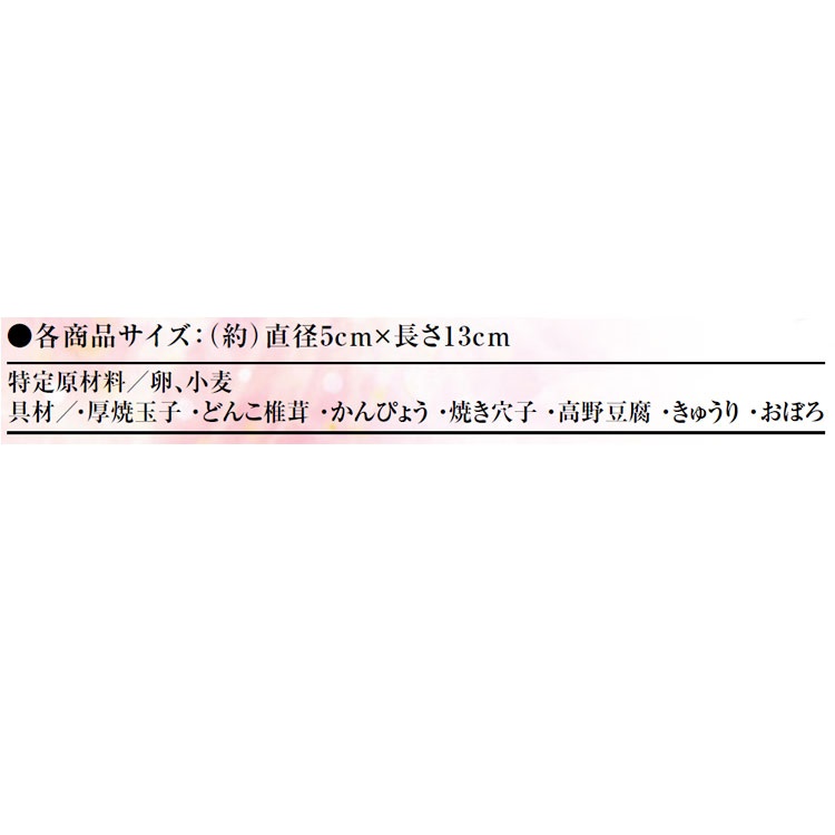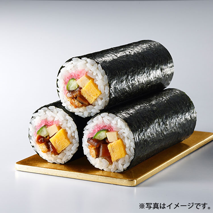 幸福をもたらす「七福神」にちなんで、厚焼玉子・どんこ椎茸・かんぴょう・焼き穴子・高野豆腐・きゅうり・おぼろ7種の具材を使用した恵方巻です。
