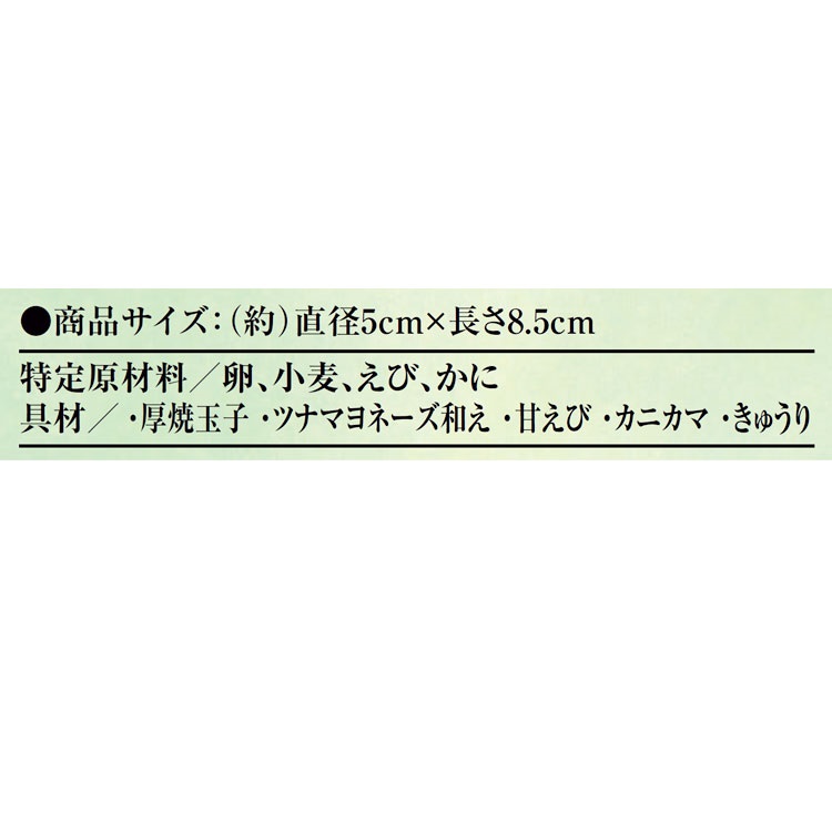 ■商品特徴 厚焼玉子・ツナマヨネーズ和え・甘えび・きゅうり・カニカマを使用し・サラダ感を出した恵方巻です。 ■商品内容 ・サラダ恵方巻1本 ■商品サイズ(約)直径5cm×長さ8.5cm