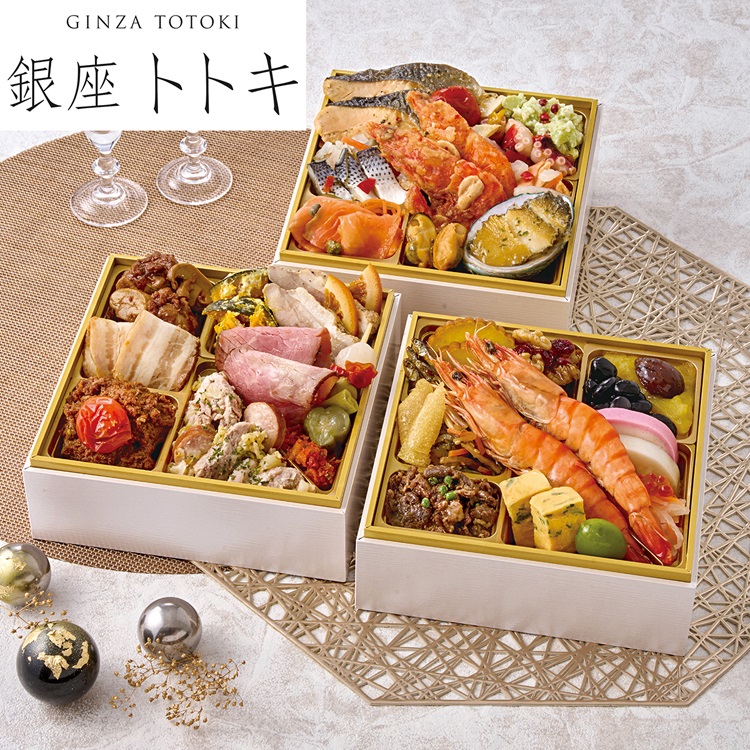 【商品内容】 三段重、お重サイズ(外寸):縦165mm×横165mm×高さ183mm(内寸の高さ(1段)39mm)、(37品目)、(約2人前)【一の重】伊達巻、クランベリーくるみ、田作り、鳴門金時芋きんとん、渋皮栗甘露煮、北海道産黒豆、北海道産昆布の松前漬、数の子、雪降り和牛尾花沢のしぐれ煮、青実山椒、かまぼこ(赤)、かまぼこ(白)、焼き海老、紅白なます、いくら醤油漬、九条葱の玉子焼、若桃甘露煮 【二の重】若鶏の赤ワイン煮込、豚ばらチャーシュー、北海道産栗南瓜のサラダ、合鴨ロースト、オレンジコンフィ、ローストビーフ、バンデリージャ(ピクルス)、セミドライトマトのマリネ、豚肉のアルザス風煮込、赤ワイン風味のビーフシチュー、セミドライチェリートマト 【三の重】カラフトマスのレモンペッパー焼、セミドライチェリートマト、魚卵ずんだのマヨネーズ風味、たこのバジルソース、小肌かぶら漬、国産キャロットオニオンサラダ、スモークサーモン、ケーパー、ガーリックシュリンプ、華やか野菜マリネ、ムール貝スモーク、鮑のオリーブオイル仕立て
