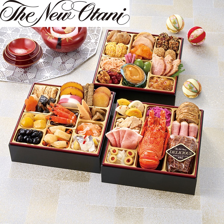 三段重、お重サイズ(外寸):縦196mm×横196mm×高さ159mm(内寸(1段):39mm)、(45品目)、(約3~4人前)【一の重】豆乳と野菜の新丈(かぼちゃ)、豆乳と野菜の新丈、桜島どりマリネチキン、紫キャベツのラペ、若鶏の三色巻、合鴨スモーク、ロブスター、生ハム、オニオンマリネ、スタフドオリーブ、十勝ハーブ牛ローストビーフ 【二の重】焼き湯葉巻、白花豆煮、梅型こんにゃく、昆布巻、伊達巻、紅白蒲鉾、たたきごぼう、鳴門金時芋レモン煮、味付け筍、蓮根旨煮、若布煮、有頭海老、金団餡、栗甘露煮、黒豆煮、紅白なます、こはだかぶら和え、松前漬、北海道産数の子【三の重】四川風チキン、錦糸玉子包み、味付きザーサイ、蒸し鶏燻製、たらのチリソース、薩摩芋胡麻まぶし、胡麻団子、大根明太子和え、クランベリーくるみ、蓮の芽(梅酢風味)、若桃甘露煮、糸昆布酢炊き、鮑煮、国産ローストポーク(黒糖風味)、中華くらげ