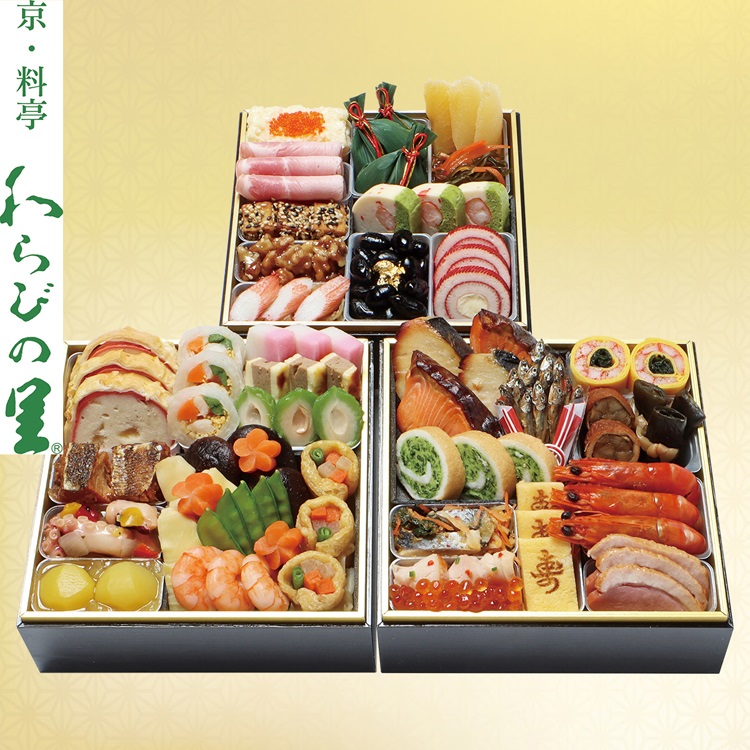 三段重、お重サイズ(外寸):縦165mm×横165mm×高さ175mm(内側の高さ(1段)35mm)、(42品目)、(約3人前)【一の重】鮭柚庵焼、鰆柚庵焼、田作り照煮、なごみ巻、花巻蒲鉾、穴子八幡巻、一口にしん昆布巻、にしん彩り親子和え、寿厚焼き玉子、海老艶煮、京なます、チキンマリネ、いくら、合鴨ロース 【二の重】りんごと豆腐のパイ包み、五色砧巻、切干し柚子、紅白蒲鉾、博多焼チーズ、若桃甘煮、棒鱈旨煮、椎茸旨煮、捻り梅人参、三色信田巻、穂付筍土佐煮、絹さや、海老沢煮、蛸バジルソース、栗きんとん 【三の重】北欧サラダ、とび子、ロースハム、笹よもぎ餅、祝い数の子、松前漬、胡麻ポテ、海老とアスパラのテリーヌ、胡桃甘露煮、福豆葡萄煮(金箔)、チーズオードブル、くらげ酢、香り蒲鉾