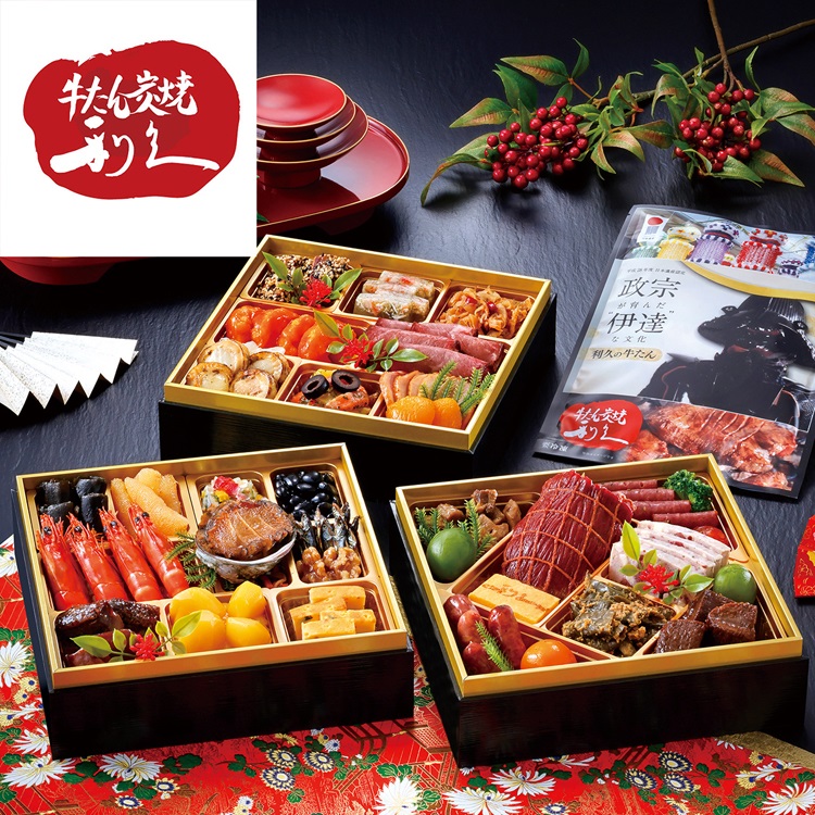 三段重、お重サイズ(外寸):縦195mm×横195mm×高さ186mm(内寸(1段):40mm)、(37品目+牛たん)、(約3~4人前)【一の重】牛たん佃煮、若桃甘露煮、おつまみ牛たん、ブロッコリーコンソメ風味、ドライトマトワイン煮、牛たんスモーク、牛たん入玉子焼、牛たんテリーヌ、南蛮味噌、牛たんちびたん燻、金柑蜜煮、牛たん角煮 【二の重】昆布巻、味付数の子、にしんレモンマリネ、黒豆煮、海老の旨煮、鮑煮、松前煮、田作り煮、くるみ甘露煮、ぶり照焼、きんとん、栗甘露煮、チーズふくさ焼 【三の重】ごまぽて、糸昆布柚子煮、かに煮こごり、帆立ひもの中華風、海老チリ、ローストビーフ、オニオンマリネ、帆立香草焼、サーモンバジル、オリーブ、合鴨スモーク、杏子煮【別添】牛たん真空パック(塩味)100g