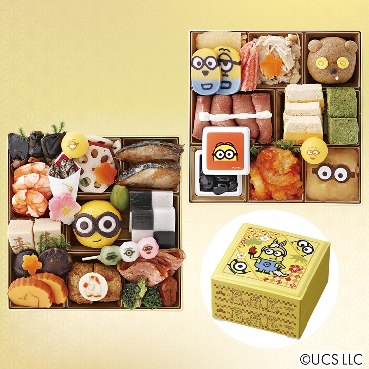 【商品内容】 二段重、お重サイズ(外寸):縦165mm×横165mm×高さ105mm(内寸(1段):40mm)、(31品目)、(約3人前)【一の重】にしん昆布巻、焼海老、田作り、ふくませ麩(梅)、ボールチョコ(ミニオン)、蓮根柚子マリネ、味付小梅人参、ぶり照焼、青桃甘露煮、ミニオン万頭(ボブ)、市松羊羹、三色団子(ミニオン)、寿高野豆腐、椎茸旨煮、伊達巻、デミグラスハンバーグチーズ添え(フラッフィ)、イタリアンソーセージ、ブロッコリーのバジル和え、ドライトマトの赤ワイン煮 【二の重】味付数の子、カニ風味かまぼこ、かまぼこ(ミニオン)、サラダチキン、味付小梅人参、ミニオン万頭(ティム)、ローストビーフ(ヨーグルトソース)、キャラメルバナナチーズケーキ、わらび餅(抹茶)、ボールチョコ(ミニオン)、黒豆、エビチリ、鳴門金時芋きんとん、ゴーグルチョコ(ミニオン)