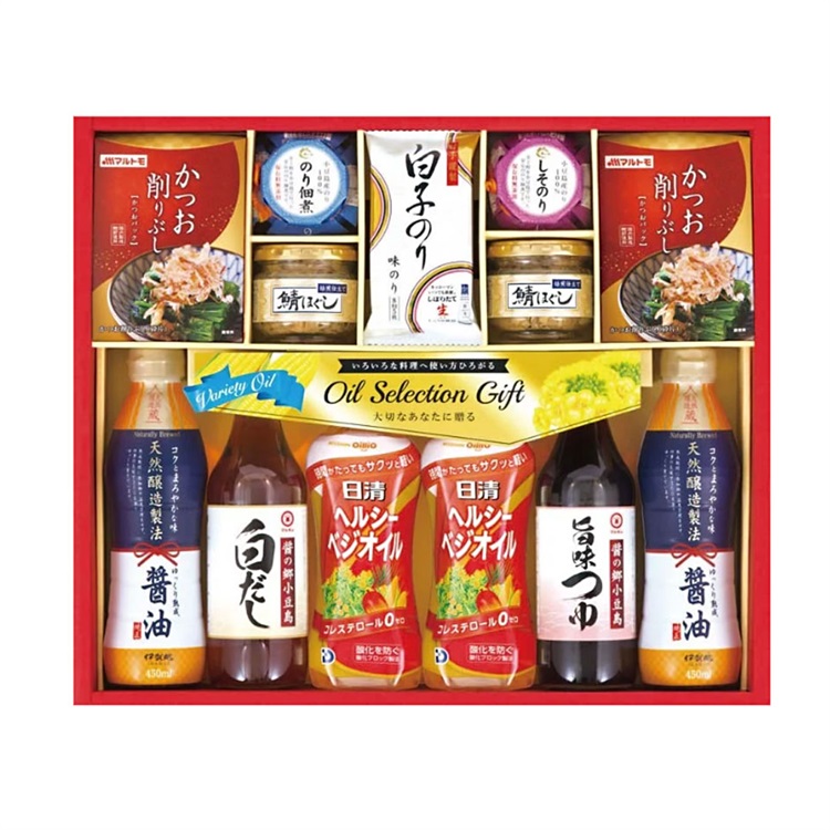 【商品内容】日清へルシーベジオイル350g×2マルキン(旨味つゆ・白だし)各360ml伊賀越天然醸造醤油450ml×2マルトモかつお削りぶし(1.5g×4袋) 小豆島産佃煮(のり・しそのり)各80g鯖ほぐし40g×2白子味のり(8切5枚)×2 【賞味期限】 賞味期限:2026年4月1日 数量限定のため、なくなり次第終了となります。ぜひお早めにお求めください。 【お届け日】 ※ご注文いただいた日の翌営業日発送予定となります。 ※お届け希望日のご指定は承れません。 ※着日指定可能商品と不可商品を一緒に購入されますと、着日指定可能商品の指定ができなくなります。 着日の指定をされたい場合は別々にご購入いただきますようお願いいたします。 ※温度帯が異なる商品を同時にご注文いただいた場合は別発送になります。(※ご注文の際に買い物かごが別になります。) 【送料について】 商品、配送先によって異なります。 詳しくはこちらからご確認ください。 >送料について □ご注文が当社で確定後のキャンセル・変更はお受け致しかねます。 □お客さまのご都合による返品・交換につきましてもお受け出来ません。 □同じ冷凍であってもギフト(お中元・お歳暮・母の日・父の日・通年ギフト)、クリスマス、おせち、恵方巻とは別発送になります。