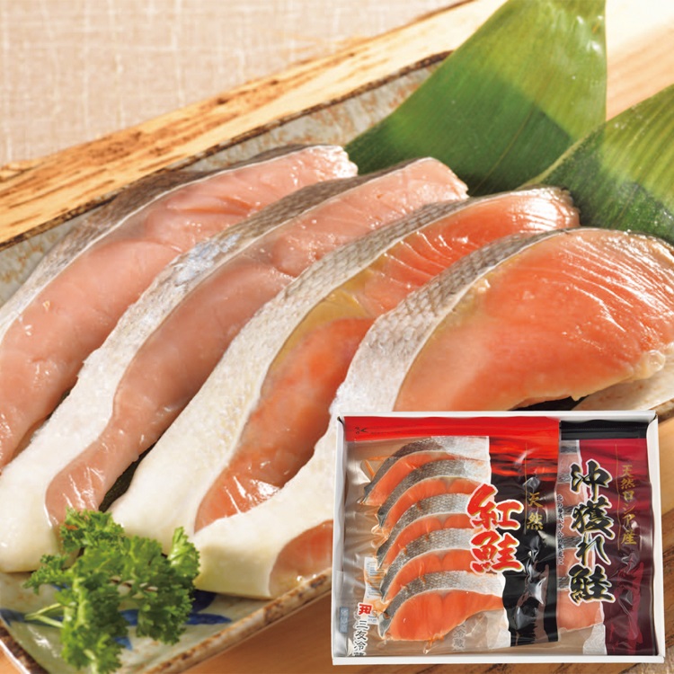 【商品特長】 北洋でとれた紅鮭と沖獲れ鮭の切身セットです。