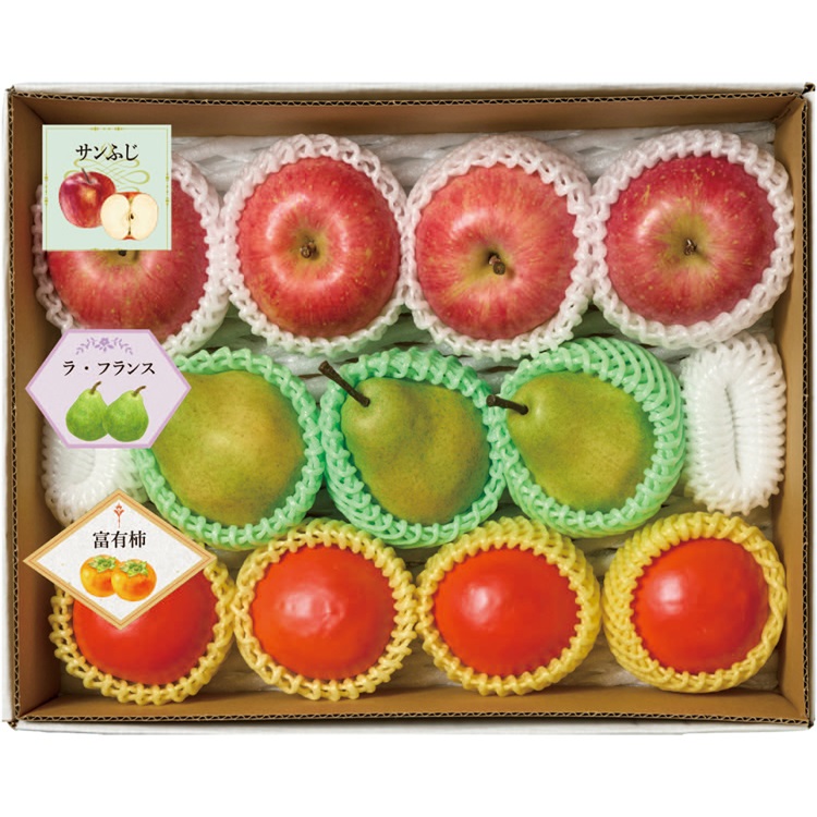 【商品内容】 サンふじ約250g×4個(青森県又は岩手県産)、ラフランス約270g×3個(山形県産)、富有柿約230g×4個(福岡県又は奈良県産)