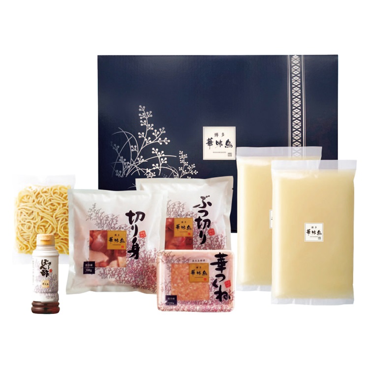 【商品内容】 約3~4人前/華味鳥(切り身・ぶつ切り)各300g、華つくね200g、水たき生スープ600g×2、博多ぽん酢220ml、ちゃんぽん麺150g