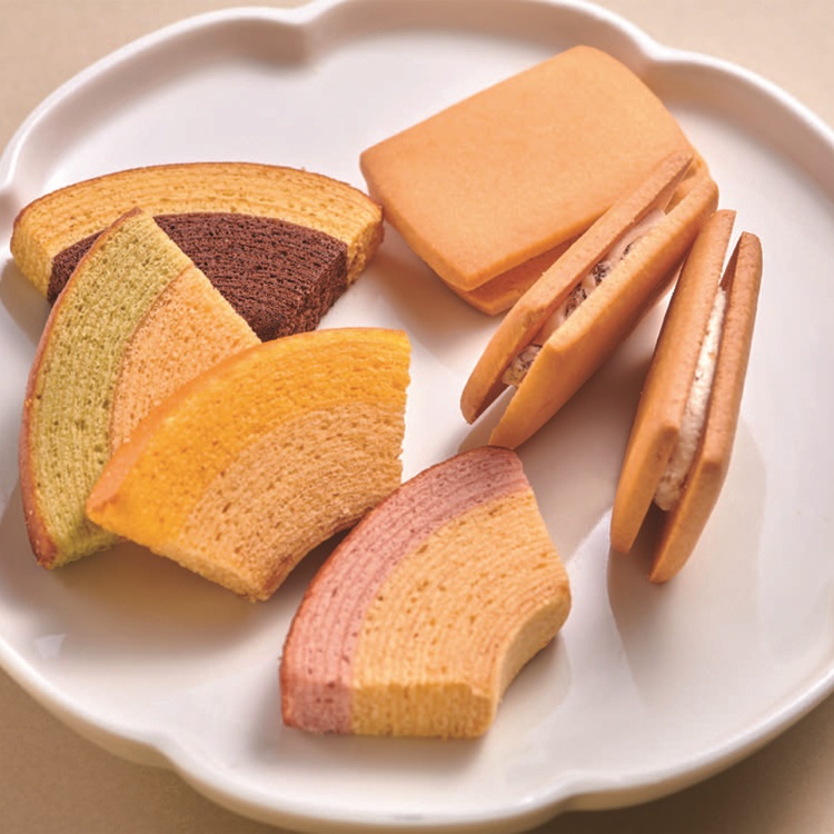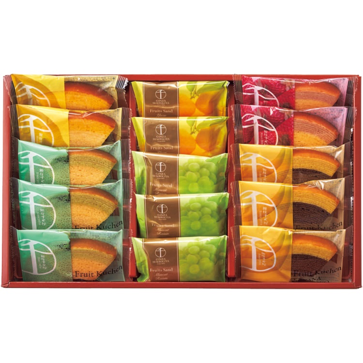 果汁を加えて仕上げた生地の2つの味が絶妙なハーモニーの銀座フルーツクーヘンと、フルーツクリームと香り豊かな果肉を香ばしいクッキーでサンドした銀座フルーツサンドの詰合せです。