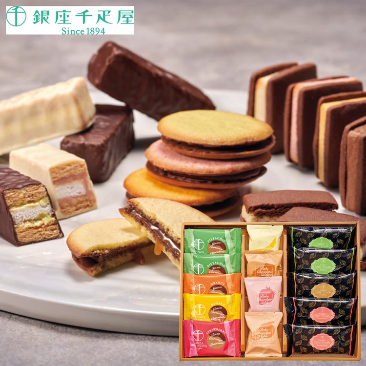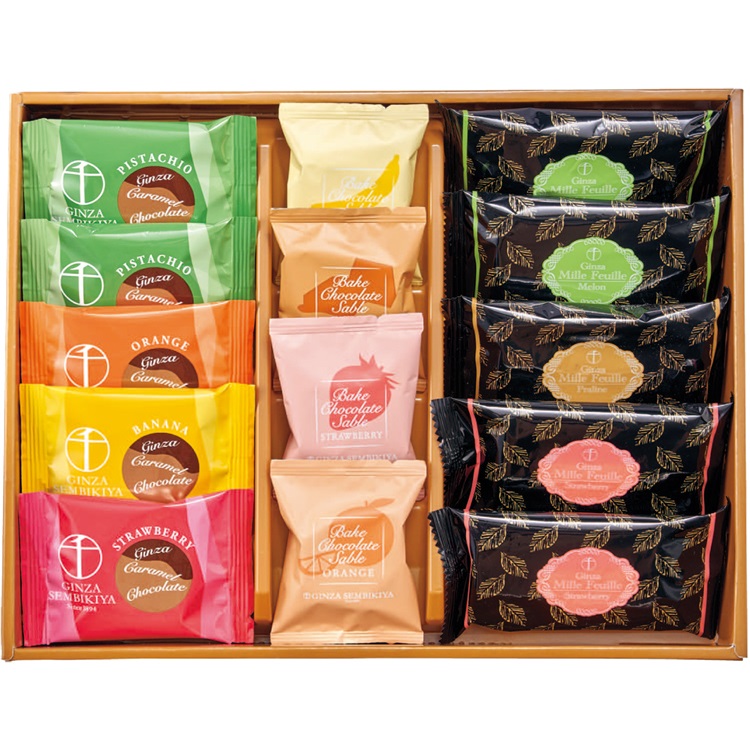 【商品内容】 銀座ミルフィーユ(メロン×2・ストロベリー×2・プラリネ)、銀座焼きショコラサブレ(オレンジ・ストロベリー・バナナ・キャラメル)、銀座キャラメルショコラ(ピスタチオ×2・ストロベリー・バナナ・オレンジ)