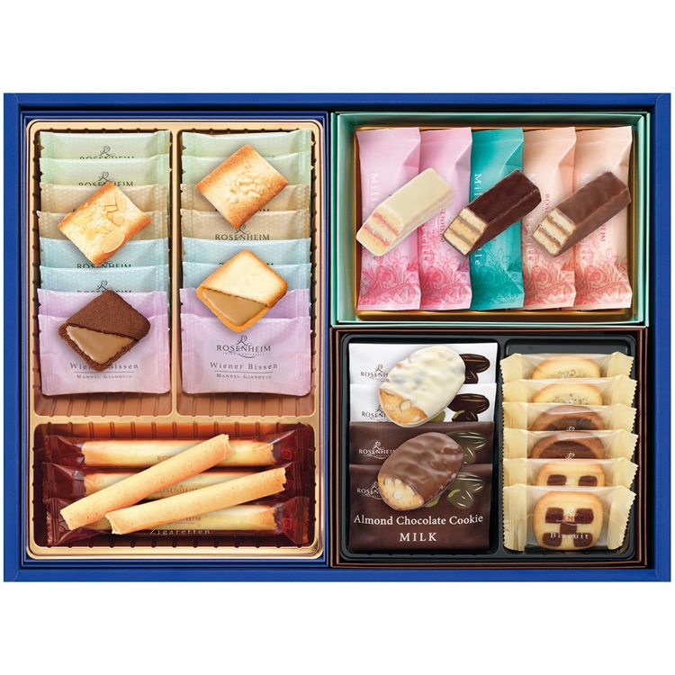 【商品内容】ミルフィーユ(ジャンドゥーヤ×2・ベリー×2・コーヒー)、ヴィーナービッセン(マカダミアナッツ・アーモンド・ヘーゼルジャンドゥーヤ・アーモンドジャンドゥーヤ)×各4、ツィガレッテン×4、アーモンドチョコレートクッキー(ミルク・ホワイト)×各2、ビスケット(チョコ&バター・チョコチップ・紅茶)×各2■賞味期限:製造後90日 ■包装形態:簡易包装■熨斗:外のし■持参包装:不可■配達区分:常温■希望着日:不可※着日指定の受付はできません。ご注文確定の15日前後にお届けします。