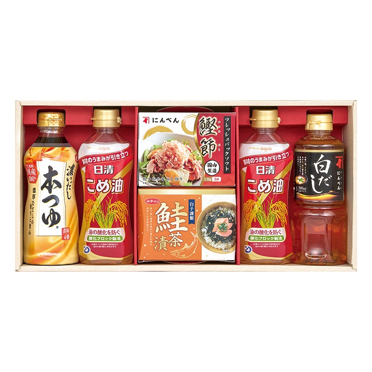 【商品内容】 にんべん(鰹節(1.5g×3袋)・白だし500ml)、日清こめ油350g×2、キッコーマン濃いだし本つゆ500ml、白子のり鮭茶漬3.8g×3袋
