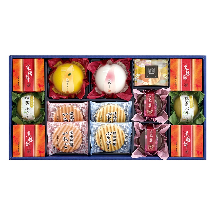 【商品内容】洋風煎餅(いちご・ぶるーべりー)各2枚入×各2、京羊羹75g×2、和楽菓煎ばにら×2、プリン(みかん・白桃)各135g、黒糖餅64g×4、抹茶ぷりん64g×2■賞味期限:製造後240日 ■包装形態:簡易包装■熨斗:外のし■持参包装:不可■配達区分:常温■希望着日:不可■全国配送:全国配送※着日指定の受付はできません。ご注文確定の15日前後にお届けします。