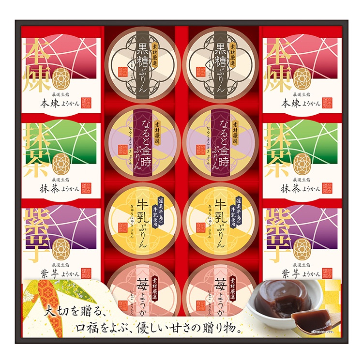 【商品内容】ようかん(本煉・抹茶・紫芋・苺)各63g×各2、ぷりん(黒糖・なると金時・牛乳)各58g×各2■賞味期限:製造後270日 ■包装形態:簡易包装■熨斗:外のし■持参包装:不可■配達区分:常温■希望着日:不可■全国配送:全国配送※着日指定の受付はできません。ご注文確定の15日前後にお届けします。