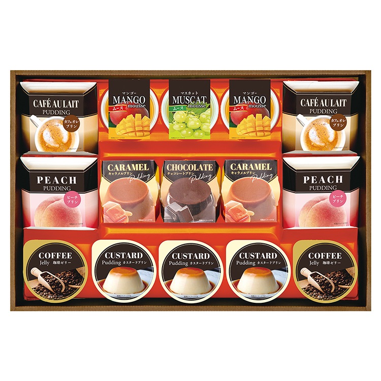 【商品内容】 プリン(チョコレート55g・キャラメル55g×2・カフェオレ90g×2・ピーチ90g×2・カスタード60g×3)、ムース(マンゴー×2・マスカット)×各75g、コーヒーゼリー60g×2