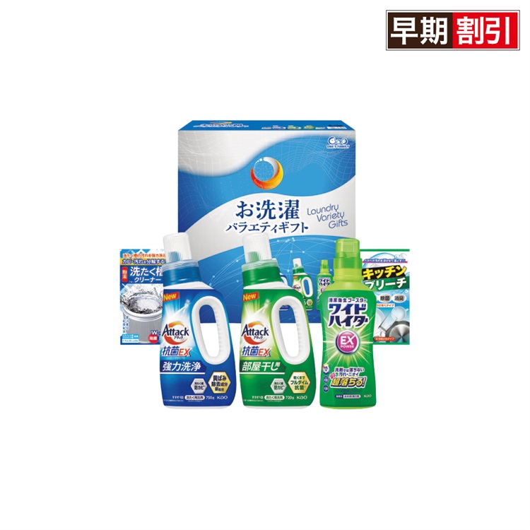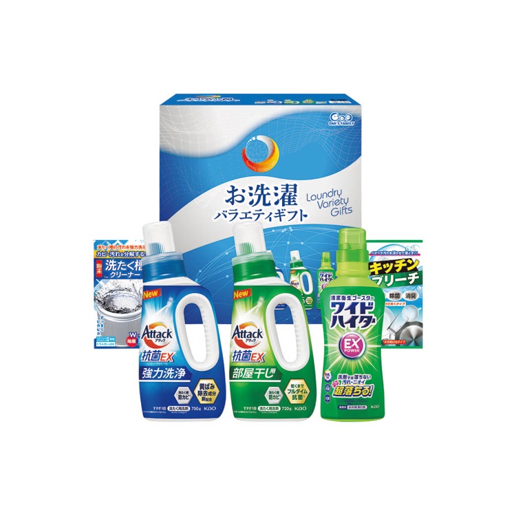 【商品内容】 アタック抗菌EX(本体750g・部屋干し用本体720g)、ワイドハイターEXパワー本体560ml、洗たく槽クリーナー、キッチンブリーチ