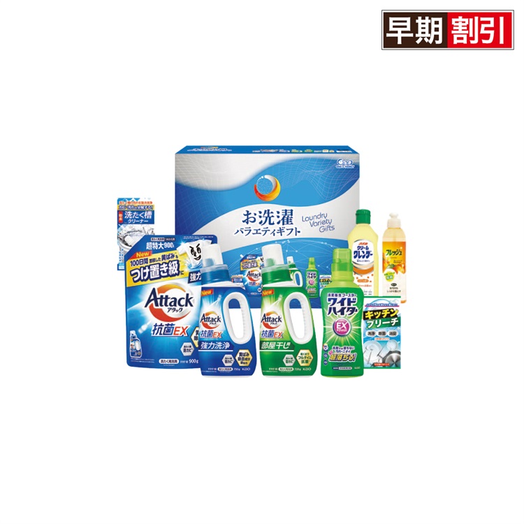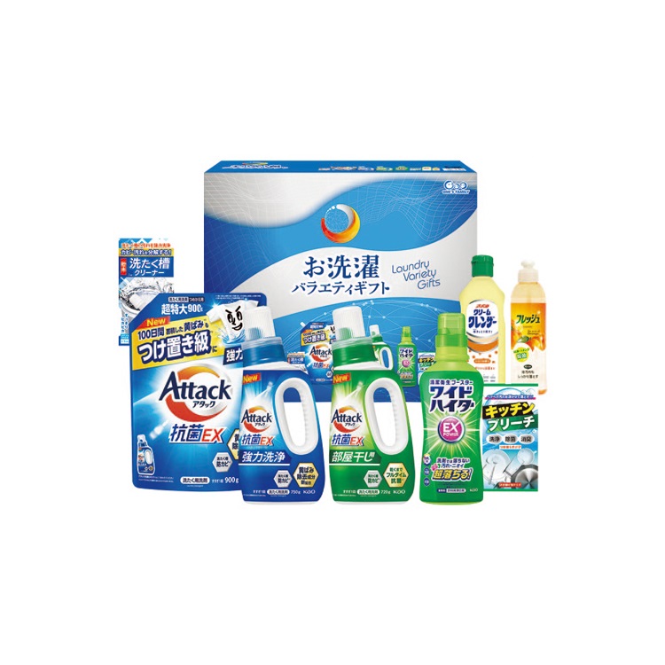 【商品内容】 アタック抗菌EX(本体750g・詰替900g・部屋干し用本体720g)、ワイドハイターEXパワー本体560ml、食器用洗剤オレンジ250ml、クリームクレンザーレモンの香り400g、洗たく槽クリーナー、キッチンブリーチ