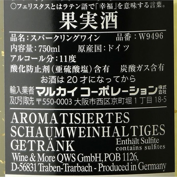 ワイン名である「フェリスタス」とはラテン語で「幸福」を意味する言葉です。記念日・お祝いの席・クリスマス・お正月など乾杯のシーンにぴったりです。豪華なゴールドボックスはギフトにもおすすめ。クリーミーな泡立ちと程よいコクの楽しめる、親しみやすい味わいで、マスカットや白いお花のような香りが特徴的です。前菜、サラダ、おせち、和食などによく合います。