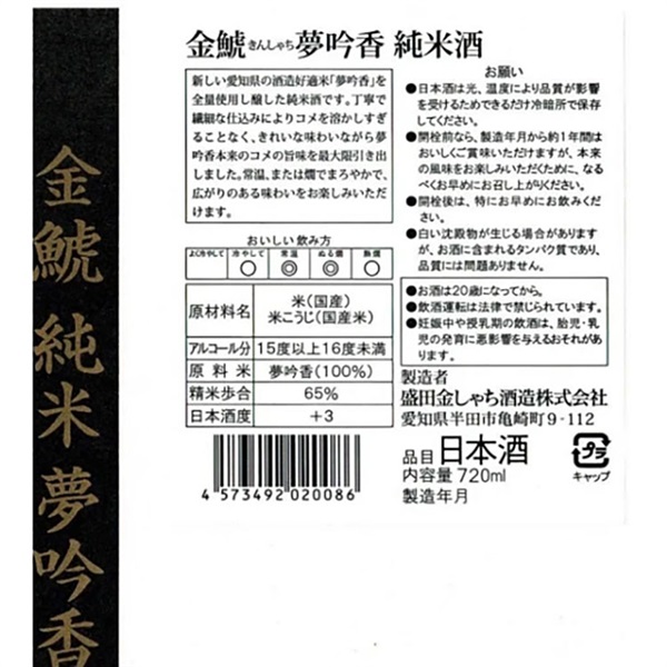盛田金しゃち酒造 金鯱 夢吟香 純米酒 瓶 720ml×6本【送料無料※一部地域は除く】