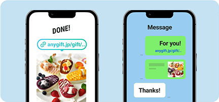 ご注文完了画面、もしくは、メールに記載のeギフトのURLをご自身で受け取り手にLINEやメールなどでお知らせください。eギフトのURLはご注文完了後に、ご注文完了画面に表示されます。また、eギフトのURLが載ったメールからもご確認いただけます。メールの件名は「【ミニストップオンライン】 eギフトのご注文ありがとうございます 」、メール差出人名は「【ミニストップオンライン】info@anygift.jp」です。
